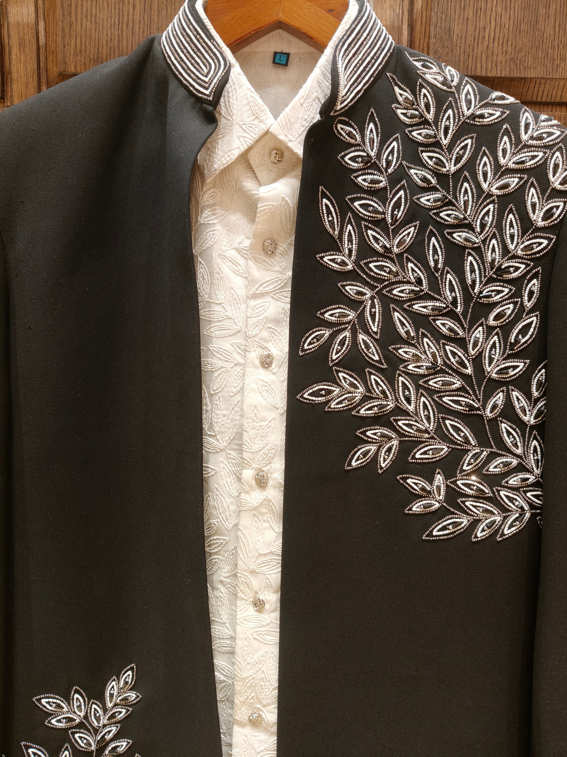 This piece redefines the traditional Jodhpuri jacket by introducing an asymmetrical, flowing botanical motif that provides visual texture against a sharp, minimalist backdrop.