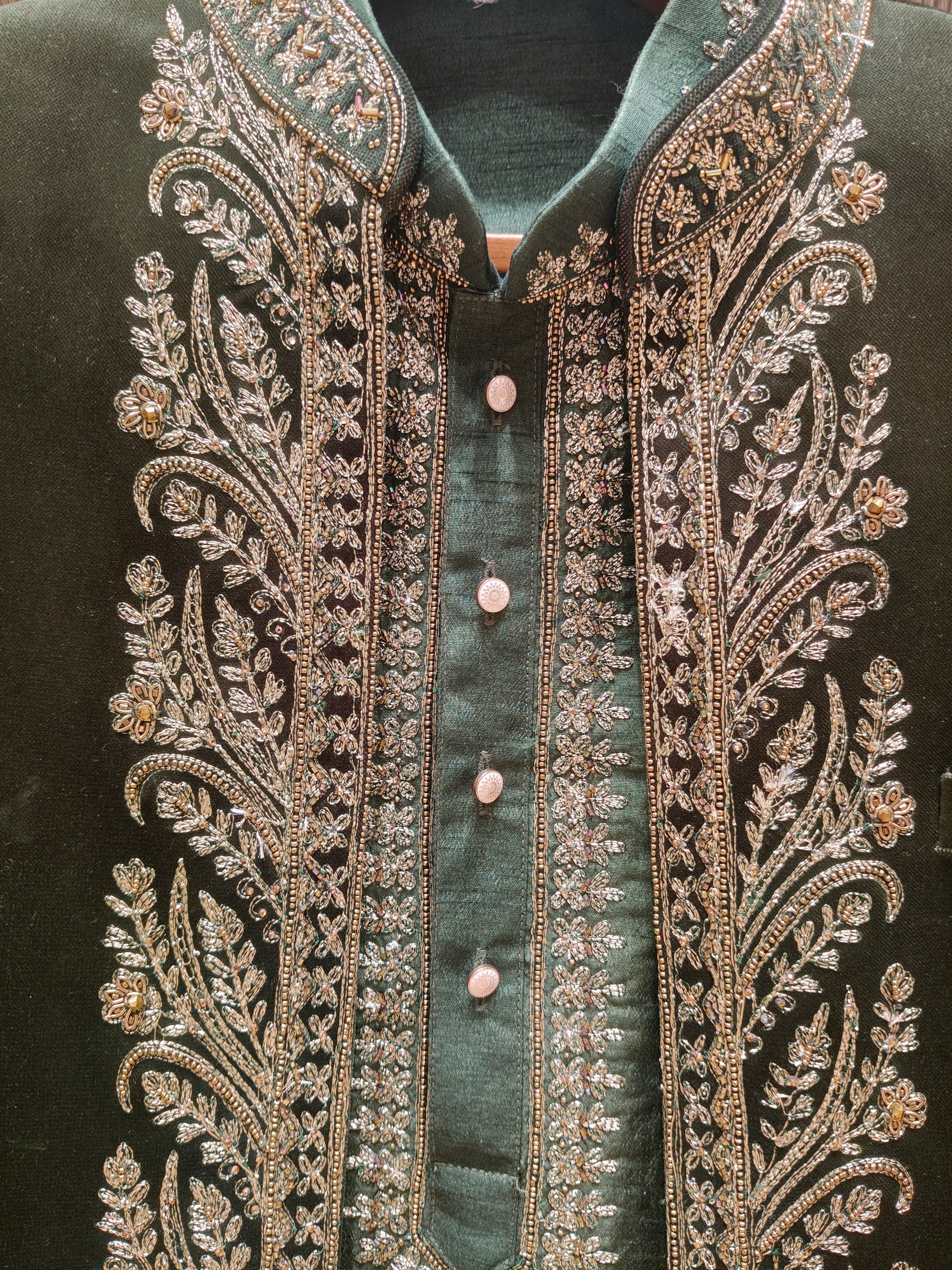 Kurta: The inner kurta is crafted to complement the jacket without overpowering it. It features scattered, subtle threadwork bootis across the chest, maintaining a cohesive aesthetic with the jacket's embroidery.