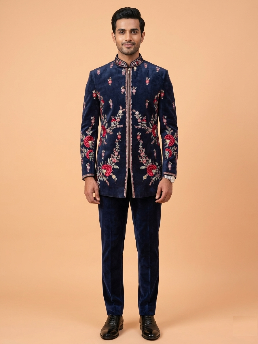 Primary Fabric: The ensemble is crafted from premium velvet, known for its plush texture, subtle sheen, and structured drape.