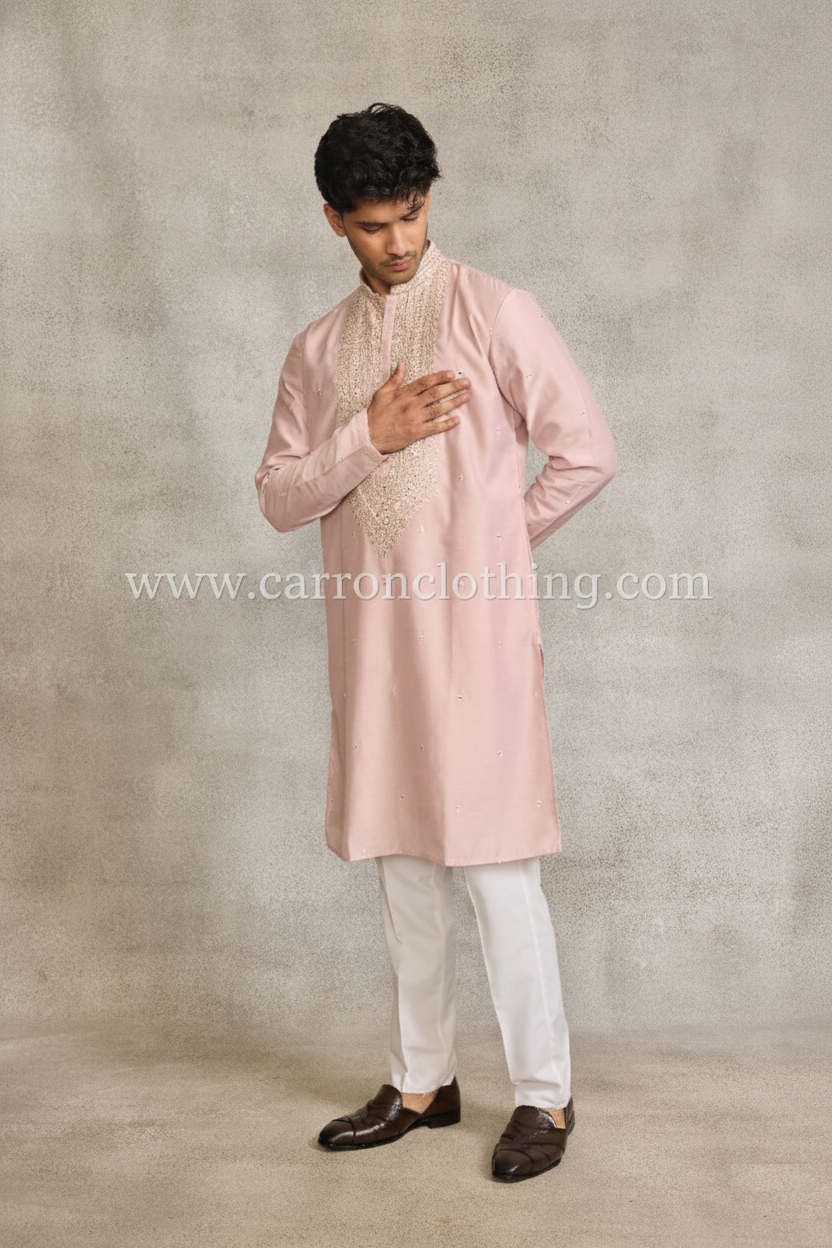 Color Palette: An elegant peach monochrome look, which is a timeless choice for groom’s wear or high-end formal events.