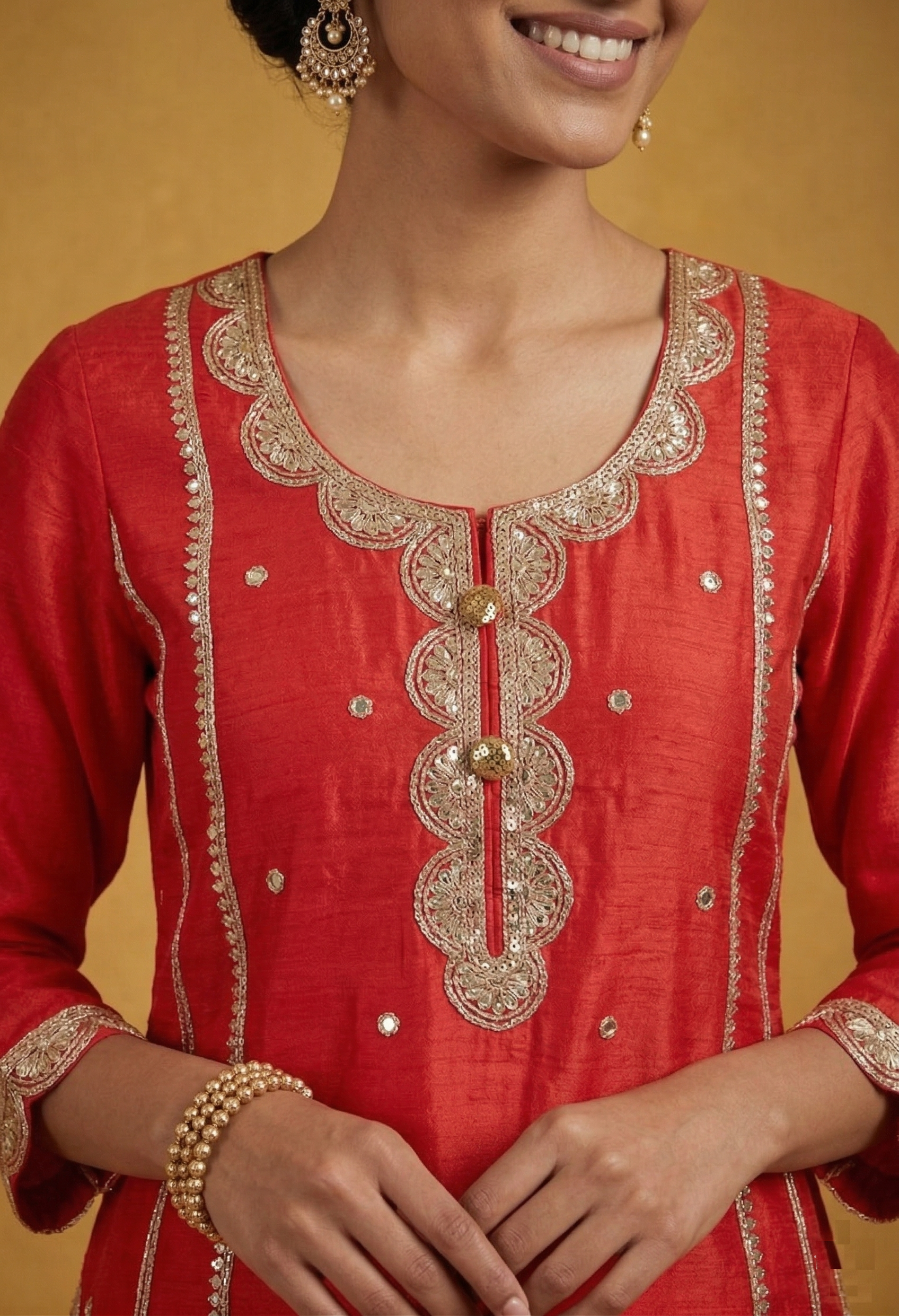 Neckline: A rounded U neckline featuring a heavy Gota Patti and gold thread-work border. It includes a decorative vertical placket down the chest with metallic button-like accents.