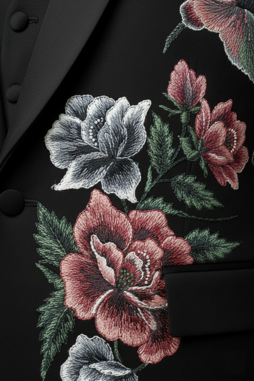 The Jacket: A black, single-breasted blazer featuring a shawl lapel in a contrasting satin finish. The standout feature is the intricate floral and avian embroidery in shades of dusty rose, white, and sage green, positioned symmetrically on the lower pockets and the right sleeve.