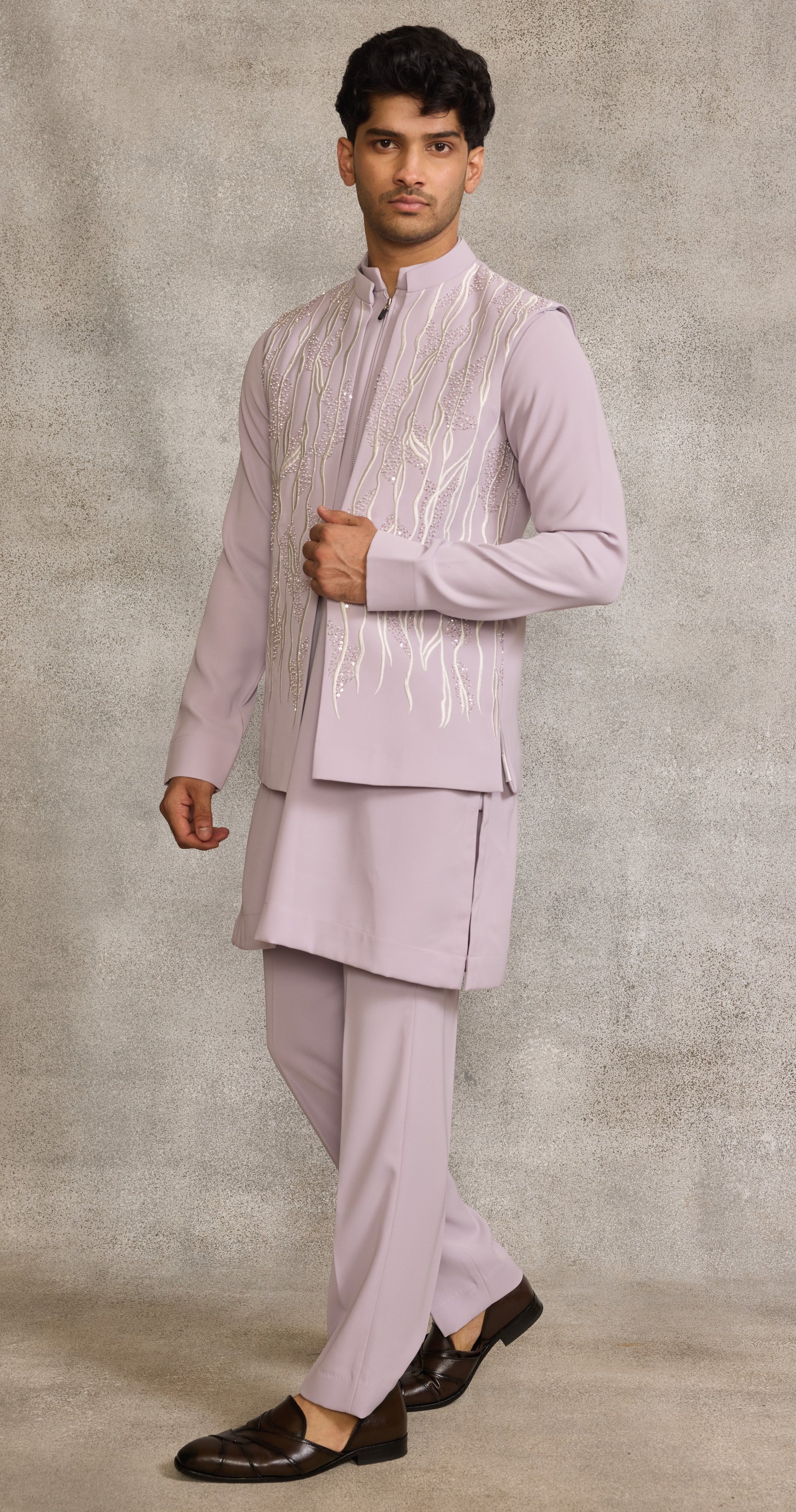 This is a stylish traditional Indian menswear, perfect for events likes sangeets, cocktail parties, & festive occasions.