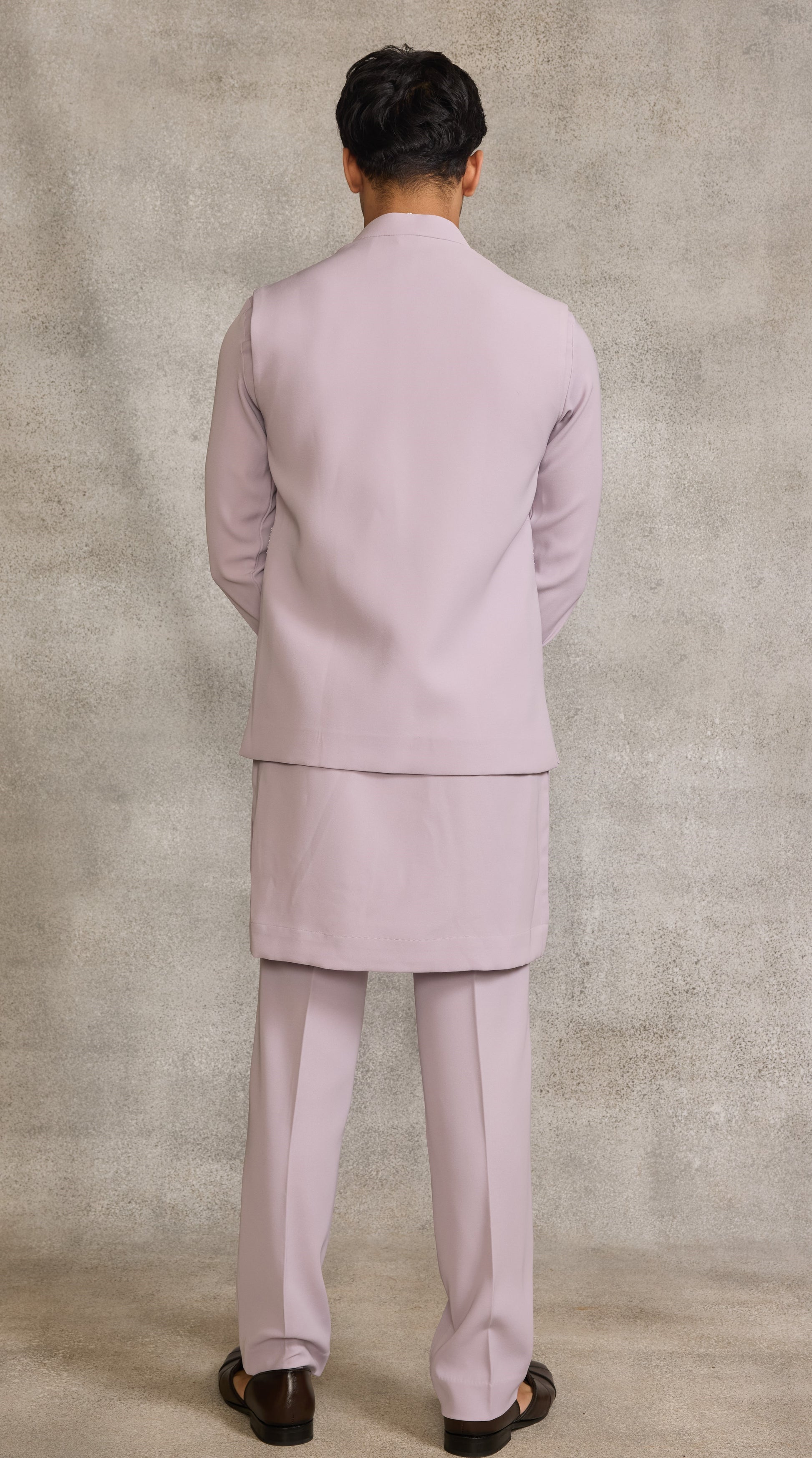 Fabric: The main fabric for the kurta and trousers appears to be a smooth, flowy material with a subtle sheen, likely a viscose blend, silk blend, This type of fabric drapes well and maintains a crisp structure. The jacket may be made of a similar or slightly sheerer fabric.