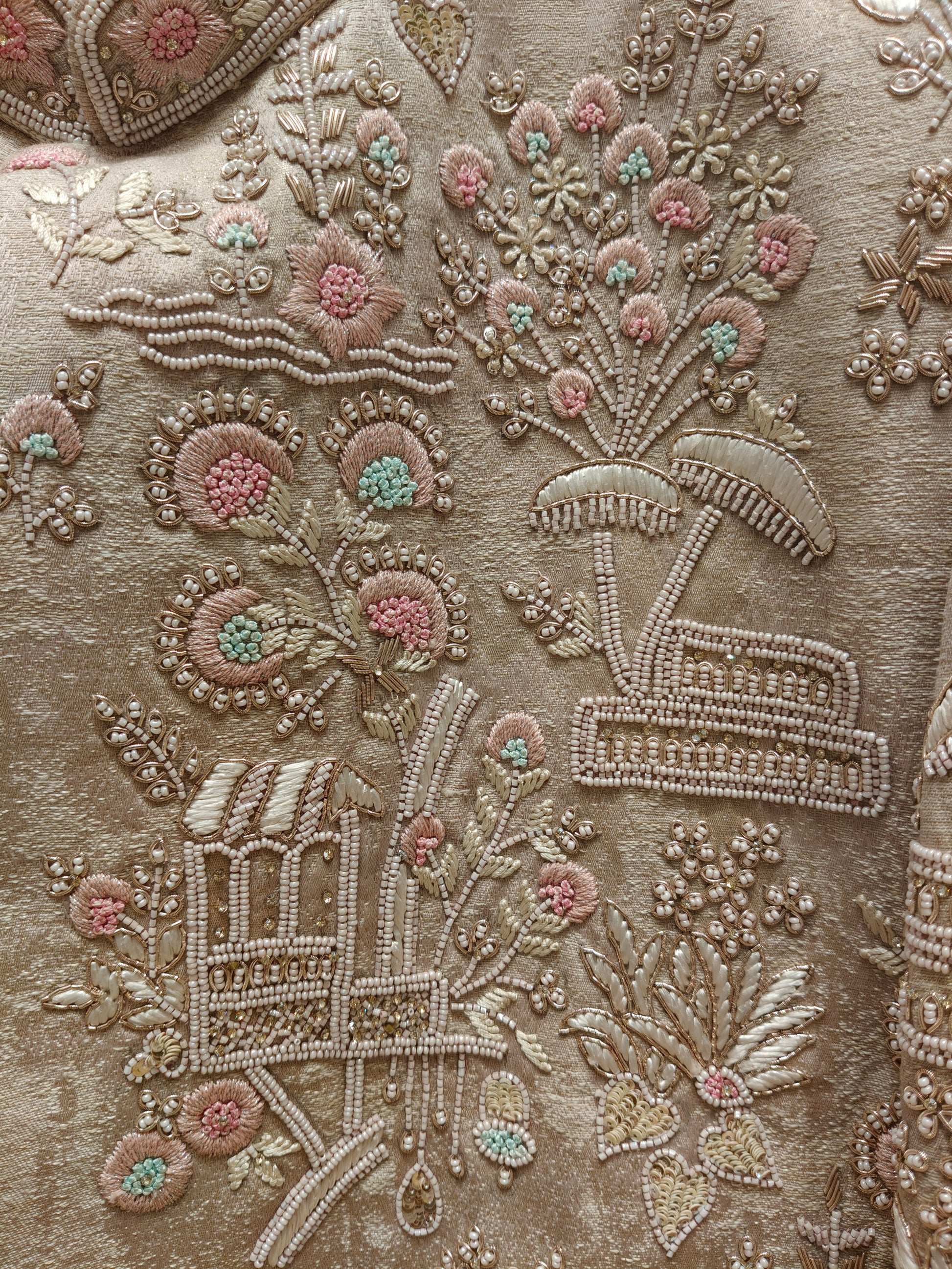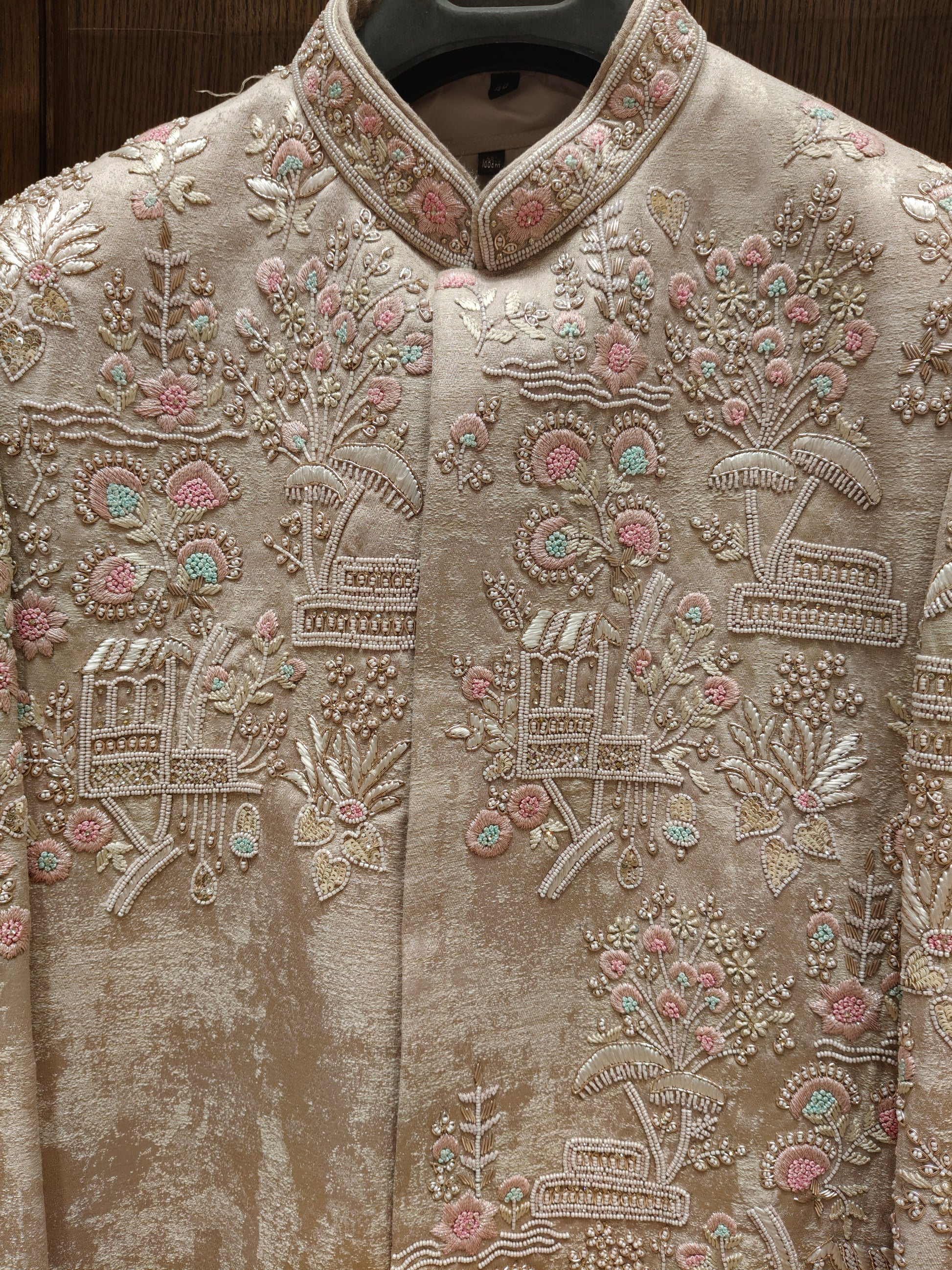Intricate Embroidery: The sherwani features elaborate, fine-thread embroidery in a harmonious palette of creams and soft pastel pinks. The motifs are a blend of subtle floral patterns and architectural designs, offering depth and visual interest without overwhelming the garment.